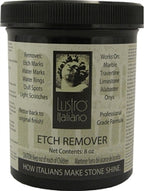 Caution: Test an area to see performance and reaction to stone first. NEVER leave Lustro Italiano Etch Remover on the surface longer than 10 minutes at a time. The powerful acid powder may blister or damage the stone.