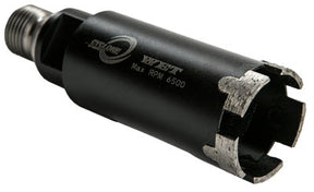 The Cyclone CNC Core Bits are specifically designed for use with CNC machines, making them ideal for working with engineered stone and granite. These bits are for wet use only and feature a T-segment design with advanced diamond technology, which increases their lifespan and minimizes segment loss. The core bits are designed with slot openings on each side to prevent blow-outs during operation, ensuring cleaner cuts. They come equipped with half-gas threading, specifically tailored for CNC machine use. The recommended feed rate for a 30mm slab is 2 inches per minute (IPM), offering precise and efficient performance.