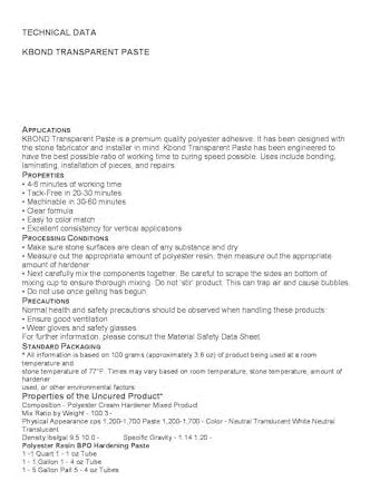 Elevate your stone fabrication projects with K-Bond Polyester Transparent Paste, a premium knife-grade adhesive designed for professionals. Engineered for the perfect balance of working time (4-6 minutes) and fast curing (30-60 minutes), this light-colored, translucent paste is ideal for bonding, laminating, seaming, edge repairs, and filling chips in natural and engineered stone. Its consistent thickness ensures easy application, even on vertical surfaces, and it can be tinted with K-Bond Color Pigments to match your stone perfectly. Offering excellent adhesion up to 160°F (70°C) and resistance to water and oil, this quart-sized adhesive is a must-have for stone installers and fabricators. Perfect for indoor use, it’s compatible with granite, marble, quartz, and more. Hardener sold separately.