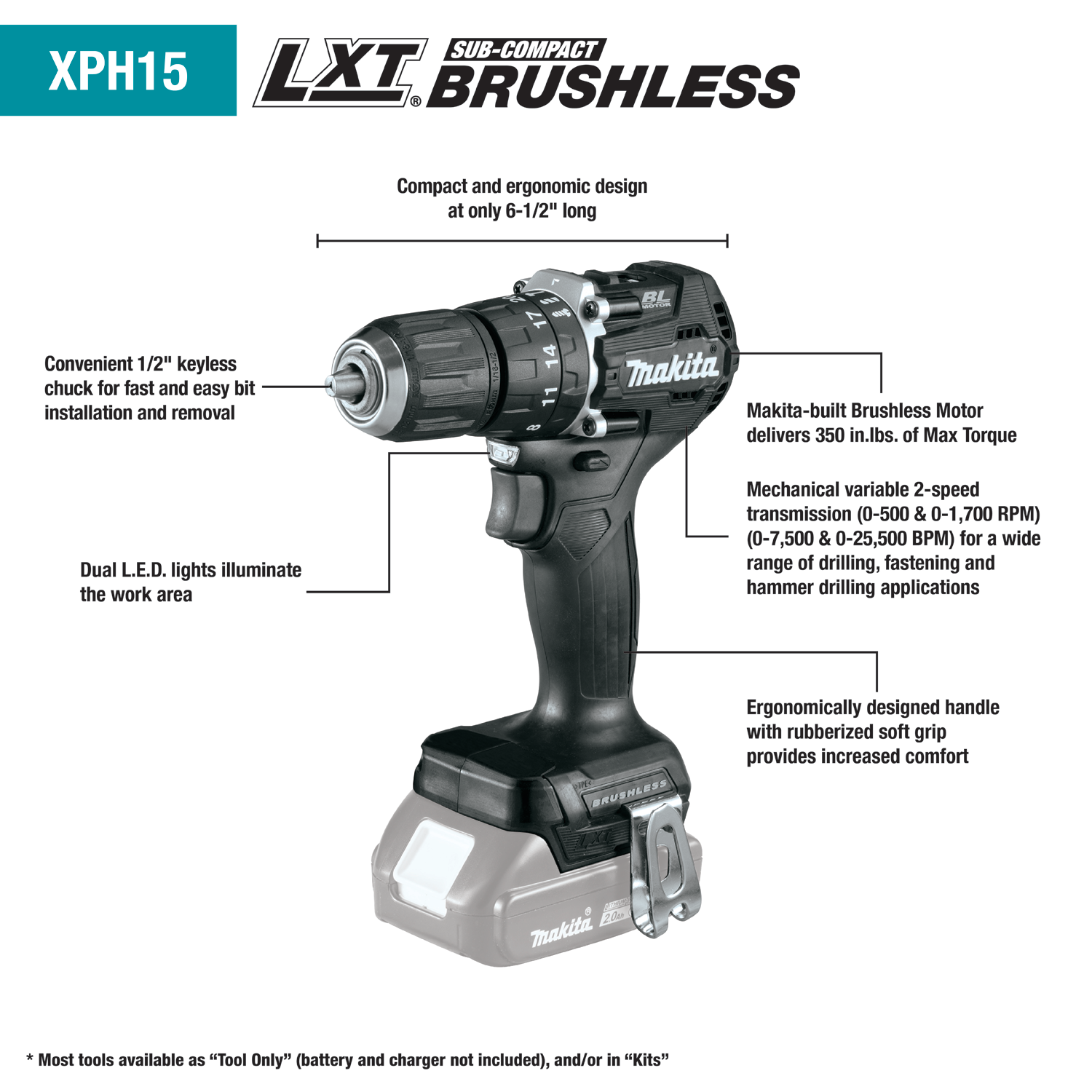 Makita 18V LXT® Sub‑Compact Brushless 1/2" Hammer Driver‑Drill — Tool Only — Designed for drilling and fastening in wood, metal, and masonry in compact spaces. Built to deliver professional‑grade performance and long service life.