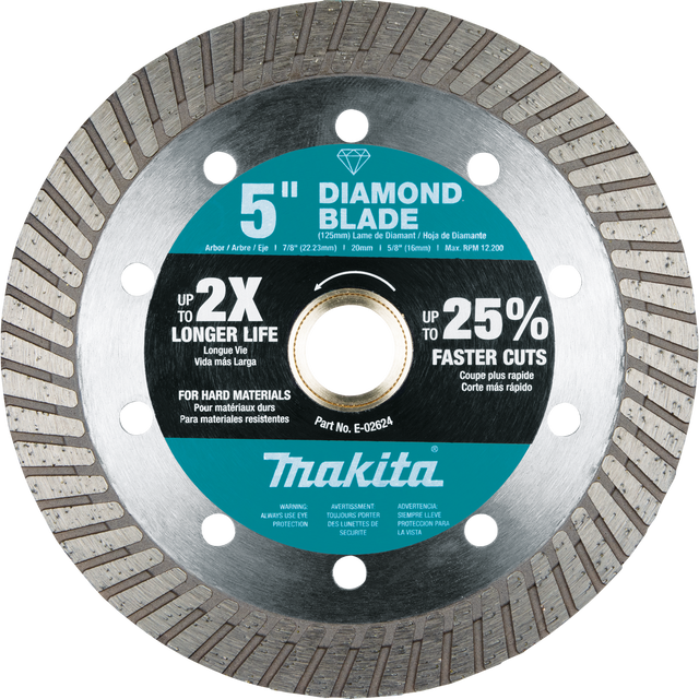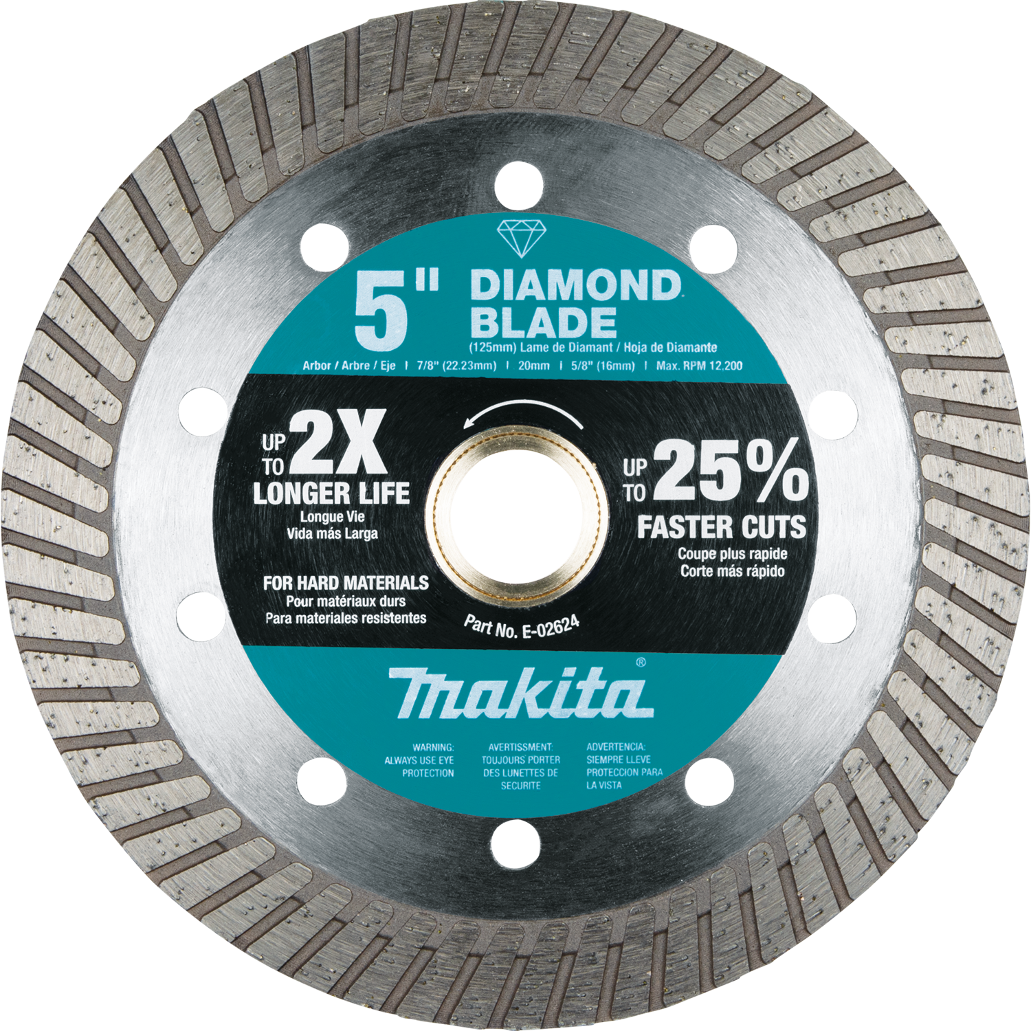 Makita 5" Turbo Diamond Blade — General Purpose — Designed for fast, smooth cutting in block, brick, pavers, concrete and roofing tile. Built to deliver professional‑grade performance and long service life.