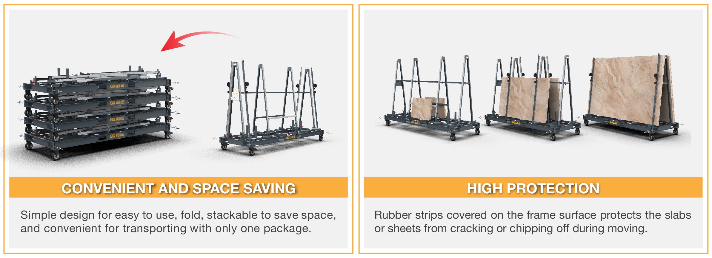 - Rubber strips cover the base and A-frame surface to prevent slabs from damage or chipping.