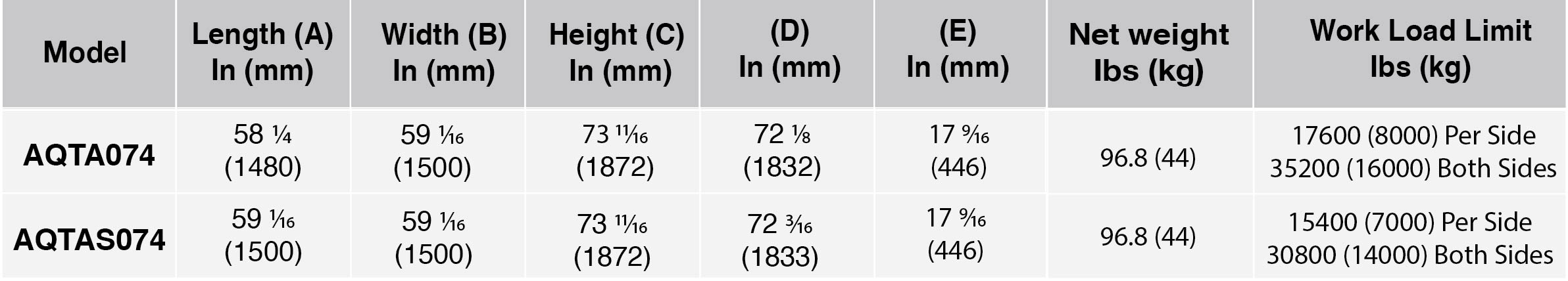 Model AQTA074, AQTAJ074, AQTAS074